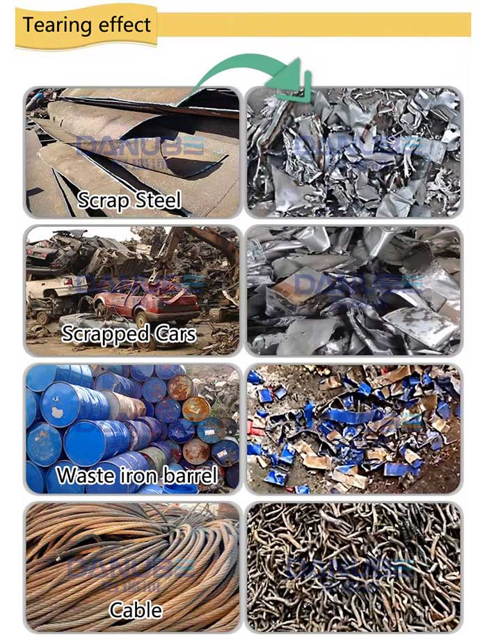 4. The metal shredder uses the crushing principles of high-pressure shearing, heavy blow, shredding, etc., simply changing the shape of the cutter head can realize the multi-purpose crushing, separation, rust removal, impurity removal, compaction, and other effects of a machine.