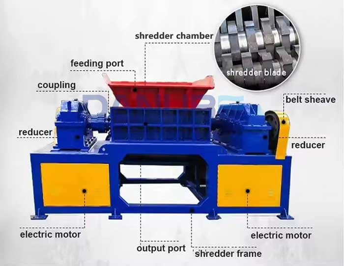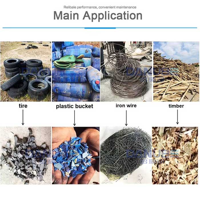 Rubber shredder machines can be used to shred large-caliber thick-walled pipes, high-toughness PE plastic packaging, scrap cable rubber, scrap rubber track, plastic plate racks, rubber products, waste tires, or other materials.