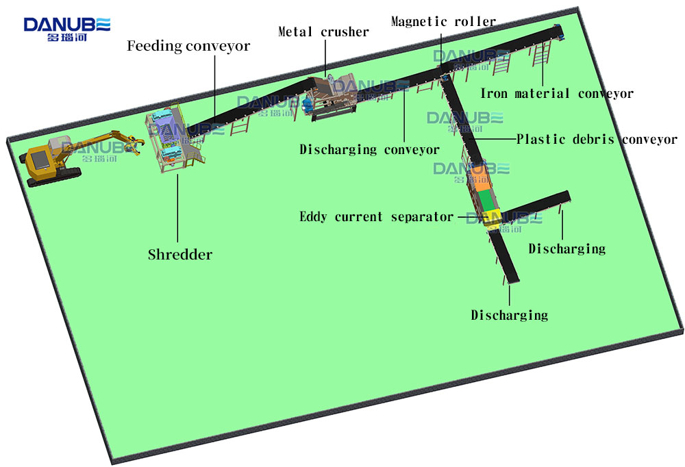 The complete set of car shredder machine equipment production line is a high-performance, high-quality, environmentally friendly and low-carbon product. It is an equipment for crushing and recycling scrapped cars and scrap metals, which is convenient for recycling. It is mainly crushed by a scrap car shredder machine, and then crushed by a metal crusher. During the crushing, wind power equipment is used to remove light materials and dust, and strong magnetic equipment is used to separate iron-containing metals. Eddy current separators are used to separate non-ferrous metals and plastics.